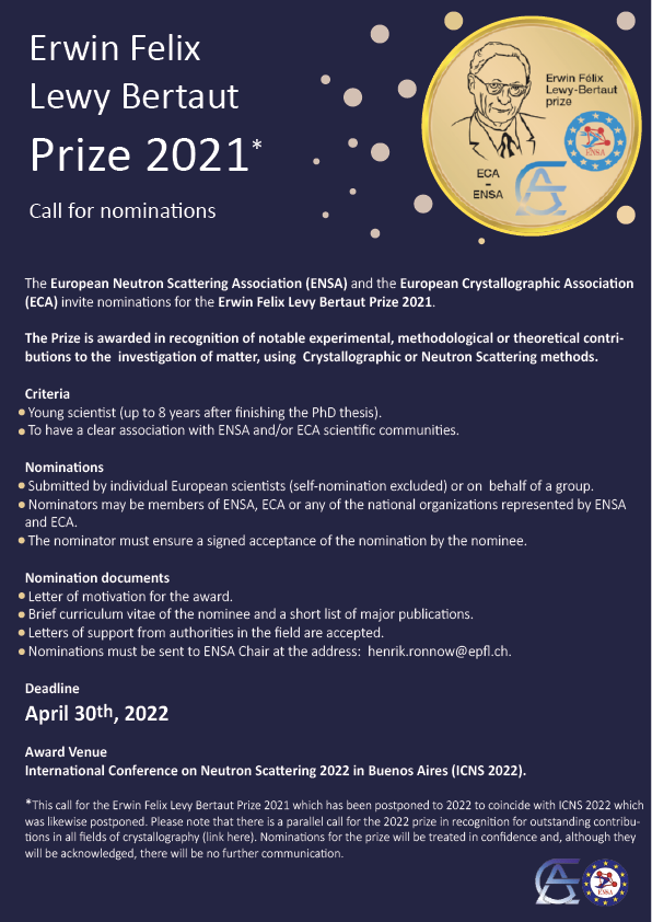 The Erwin Felix Lewy Bertaut prize is awarded jointly by the European Neutron Scattering Association (ENSA) and the European Crystallography Association (ECA) in memory of the scientific achievements of Erwin Felix Lewy Bertaut, a pioneer in crystallography and neutron scattering. The prize is sponsored by Mirrotron.