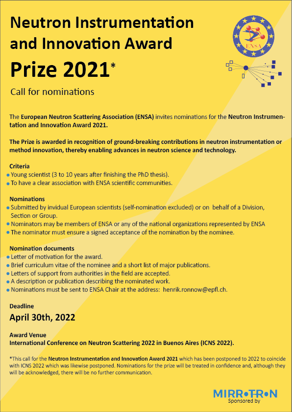 The European Neutron Scattering Association hereby announce the inauguration of a new prize, the Neutron Instrumentation and Innovation Award. The prize will be awarded to an early career scientist or engineer in recognition of ground-breaking contributions in neutron instrumentation or method innovation, thereby enabling advances in neutron science and technology. This includes realization of new neutron instruments, pioneering of neutron science in new fields of applications, invention of new neutron techniques or development of new analysis methods and software, as well as other major contributions enabling advancement of neutron science. Early career typically means 3-10 years after a PhD, but both younger and more senior candidates may be considered. The prize amount (2072 CHF) is generously sponsored by the company Mirrotron, a leading manufacturer of neutron instrumentation components. The Prize will awarded biennially (synchronized with the European or international Neutron Scattering Conferences).