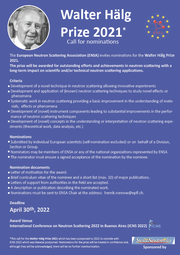 The Walter Hälg Prize was first made available to the European Neutron Scattering Association (ENSA) by a donation from the late Professor Walter Hälg who was the founder of neutron scattering in Switzerland. His wife Madeleine Hälg-Degen continued to sponsor the highly prestigious ENSA prize in his name. After the exhaustion of the Hälg donation, the company SwissNeutronics AG recently agreed to continue the sponsorship of the highly prestigious ENSA prize starting in the year 2019.